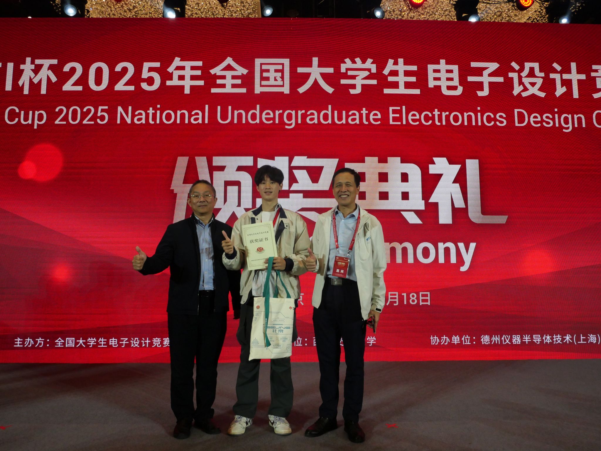 本站讯 (通讯员 曾旭杰)10月18日上午,2025年全国大学生电子设计竞赛(TI杯)颁奖典礼在北京举行。我院首次出征赛事斩获佳绩,一支队获全国大学生电子设计竞赛(本科组)全国二等奖,并代表海南省受邀参加颁奖典礼。